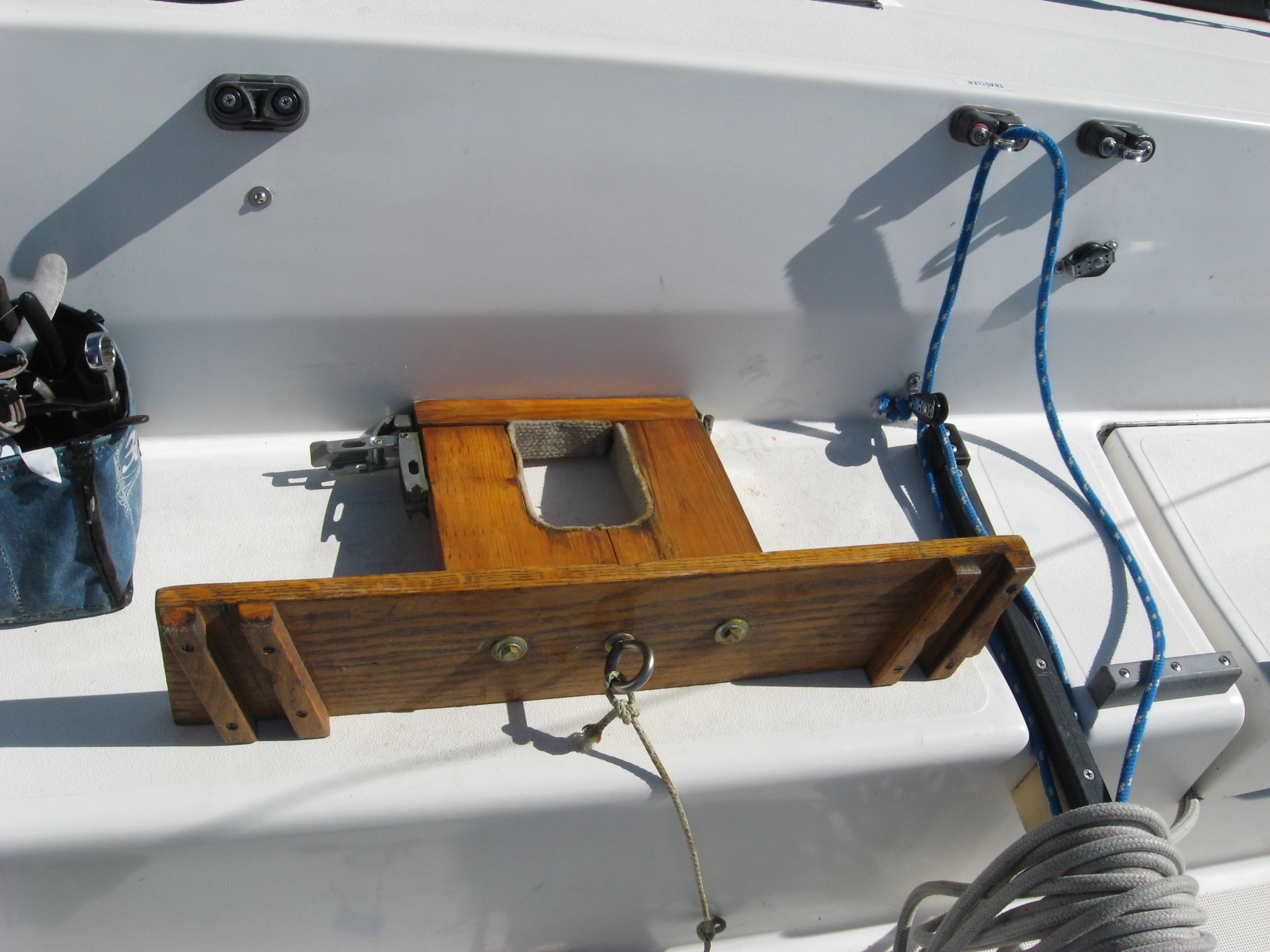 The bow support fits nicely on the bow pulpit and locks the mast down with a hinged wooden bracket.