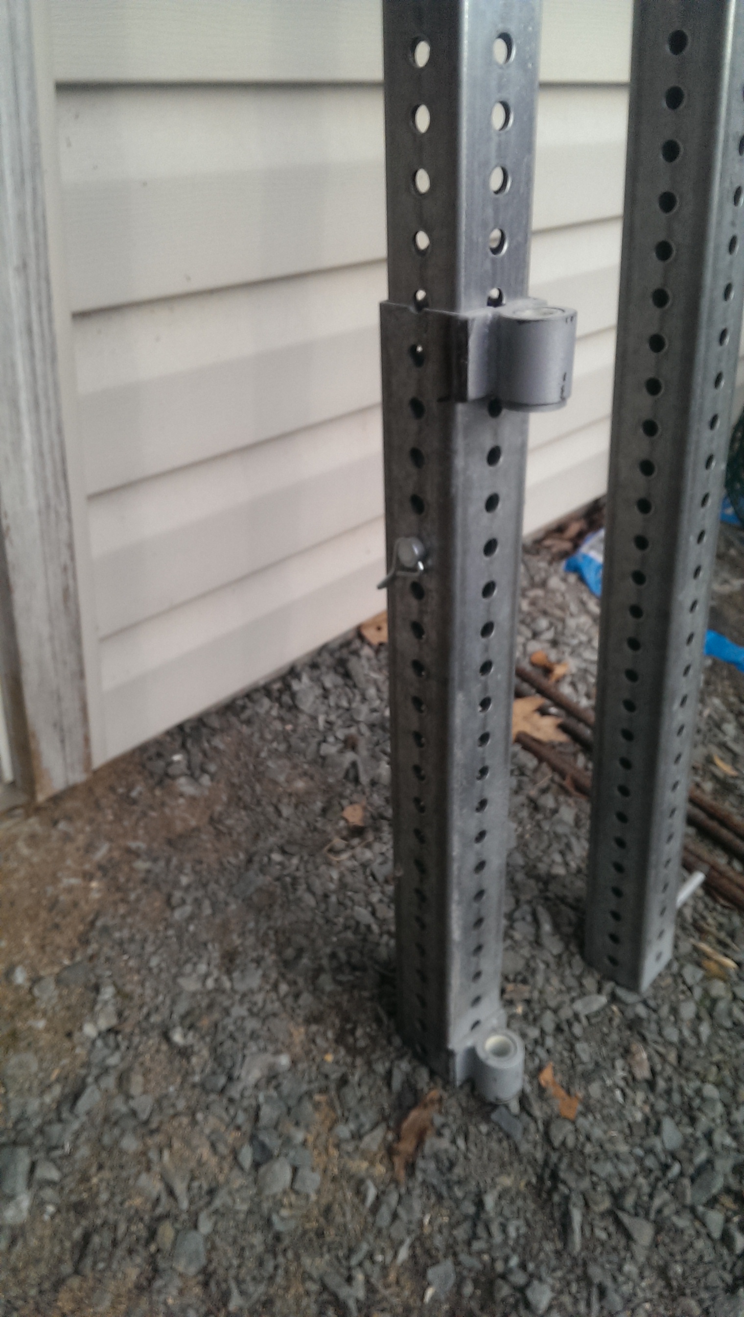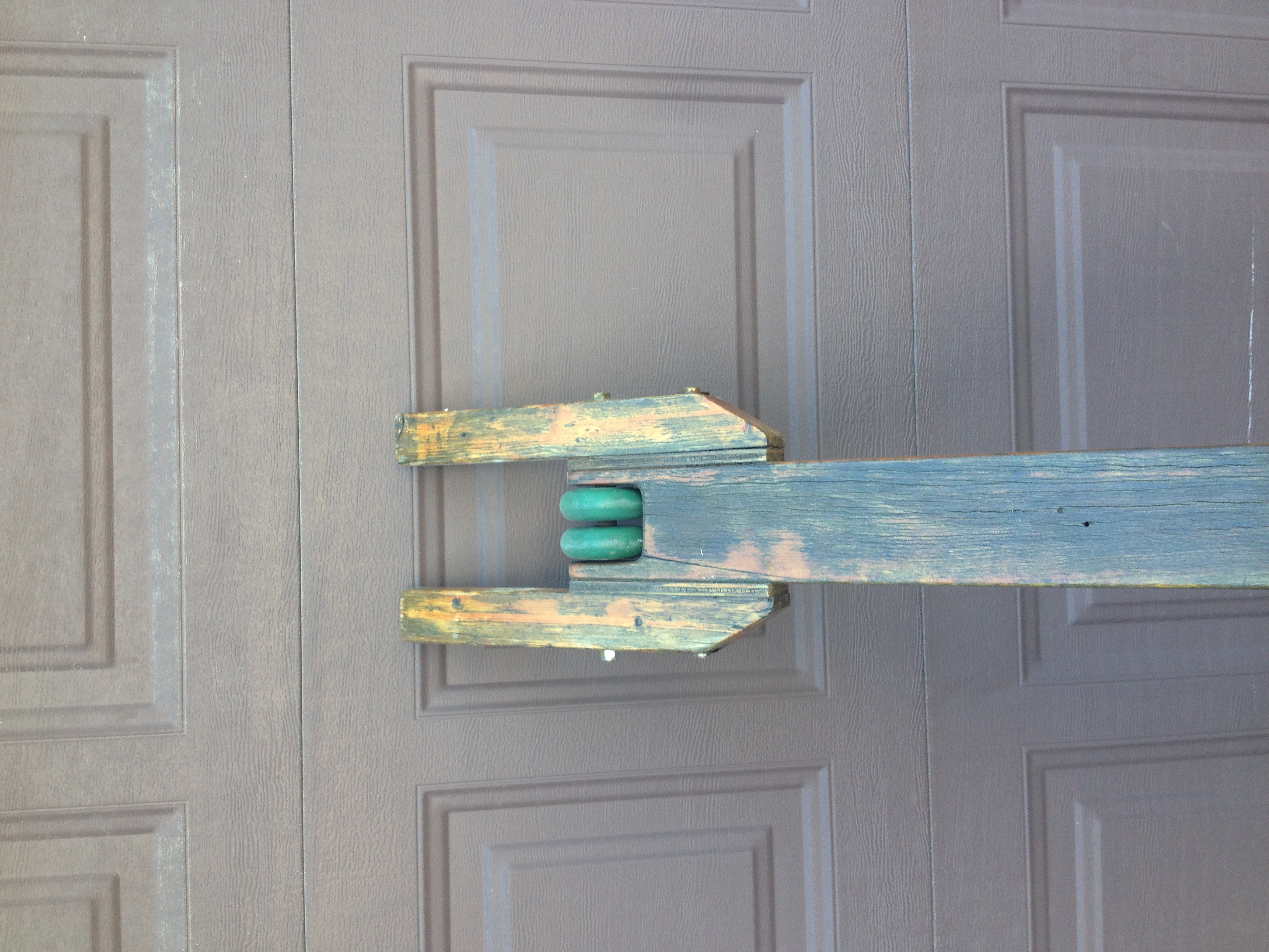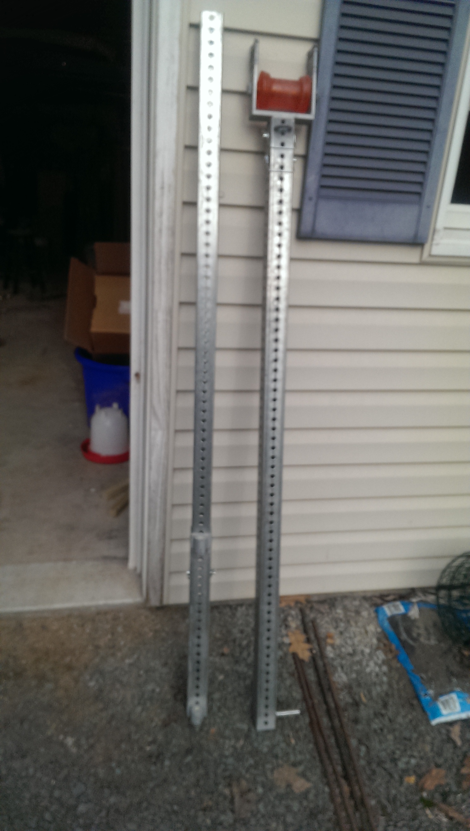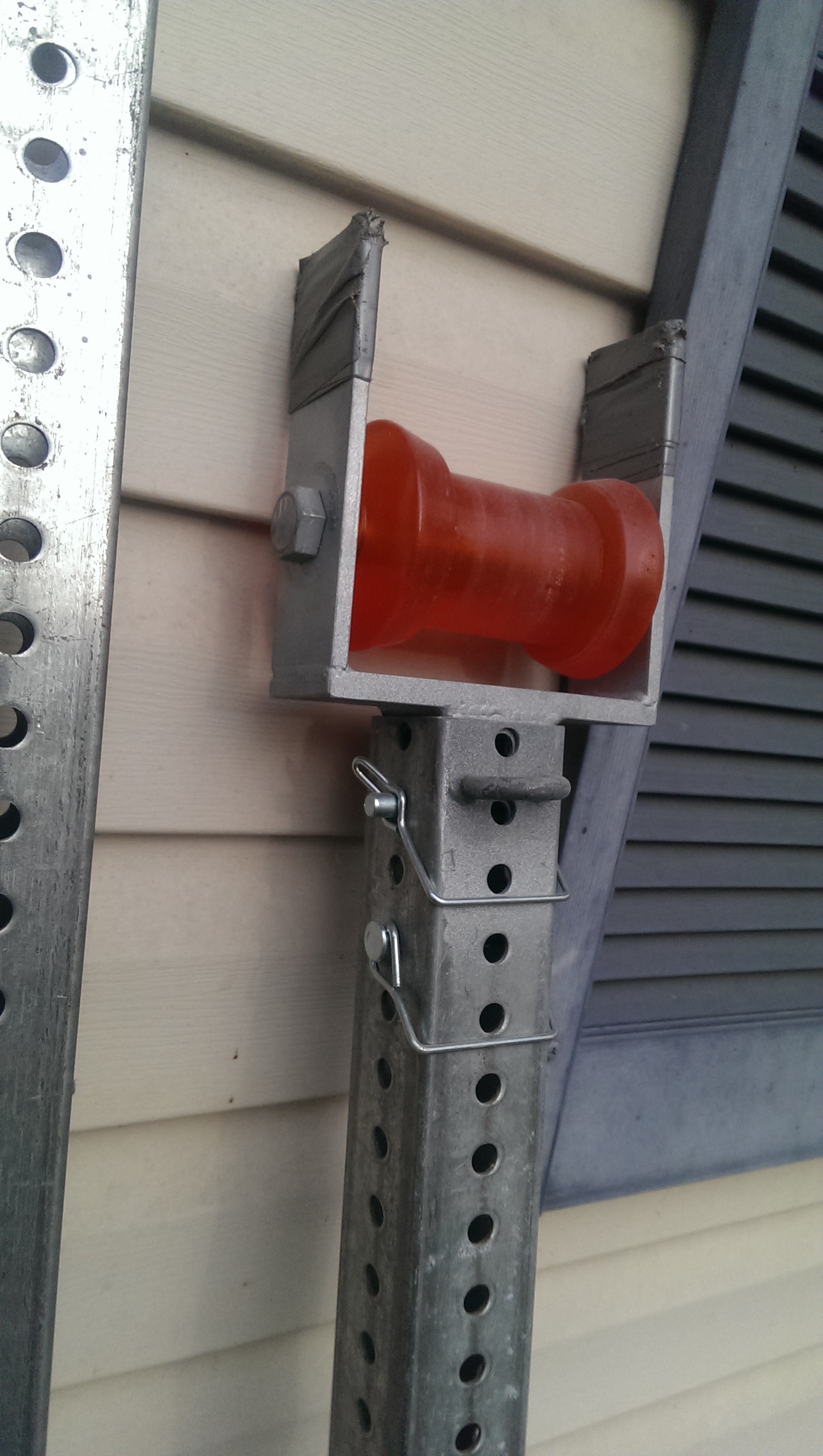 I used 3 eye-bolts through the center 2x4, spaced exactly the same apart, so I'd have a HIGH setting, and a low setting for the support... the High setting would be for mast raising/lowering, the low setting would be for travel on the road.