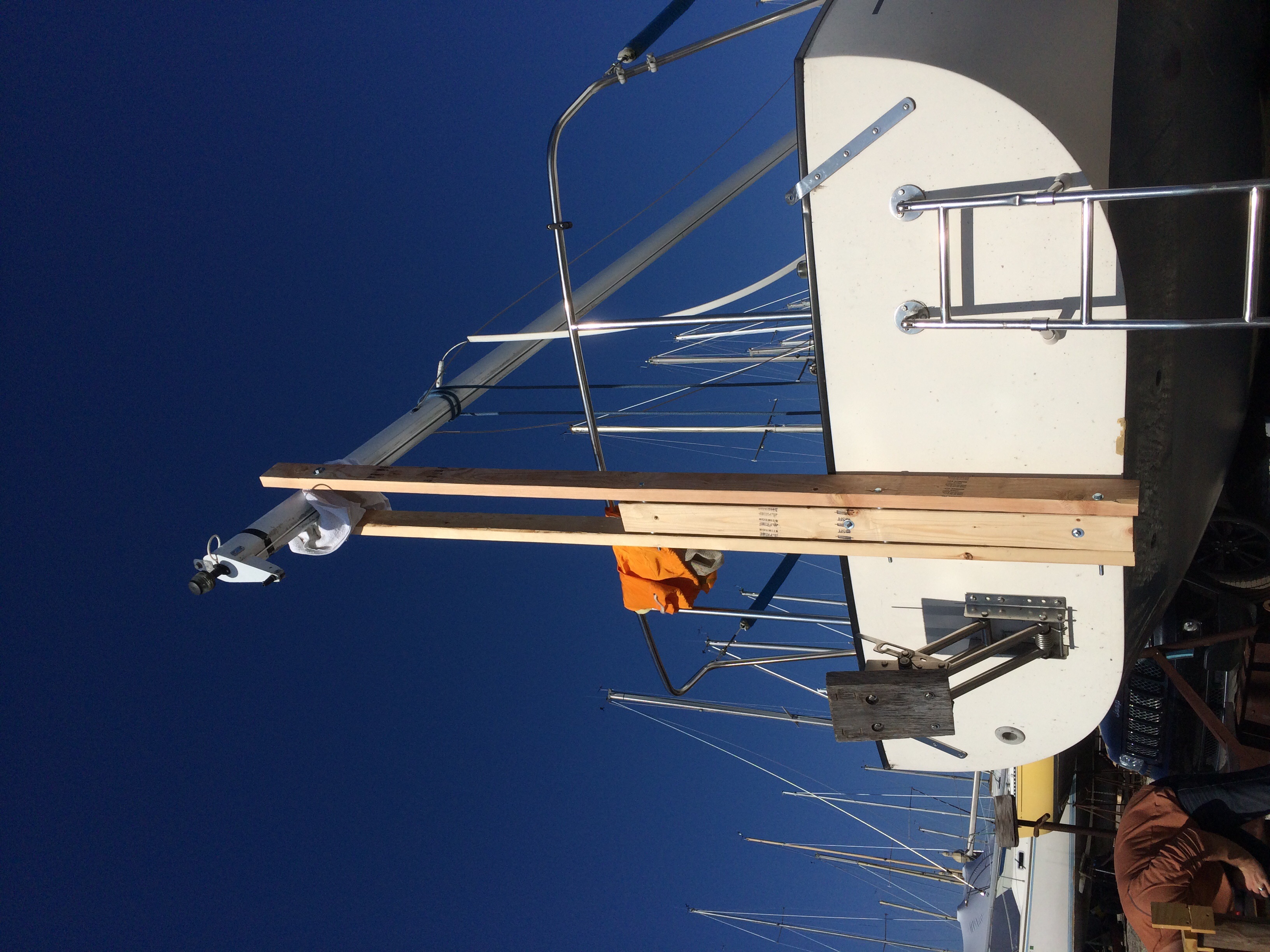 I've attached a few pictures of the mast support for my boat. The stern support has three brackets which allow the mast to be level for trailering or lifted up for a steeper angle when the boat is covered for the winter. The rollerblade wheels really make the mast slide back n' forth easily. The stern support also has small wooden blocks to make it easier to climb into the boat.