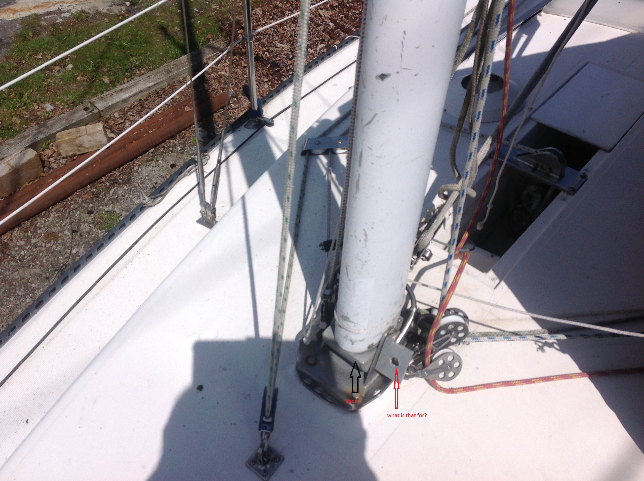 thank you that was fast, I'm more visual and from what I saw,there is like a shoe( for lack of a better term) at the mast with 3 or 4 holes on each side. see pictureSailingUphill wrote:Most of your questions have been answered in various sections of this forum already, but I'll give you the cliffs notes version of answers for most of them.